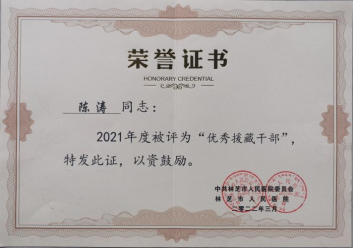 援藏期间,陈涛守初心、担使命,用心用情用力做好各项对口支援工作,得到当地领导、同事、群众的高度评价。2021年荣获中共林芝市人民医院委员会、林芝市人民政府颁发的“优秀援藏干部”荣誉称号、2022年荣获中共林芝市委员会、林芝市人民政府颁发的“优秀援藏干部人才”荣誉称号,2022年林芝市委组织部、林芝市卫健委授予“学科建设先进个人”荣誉称号。