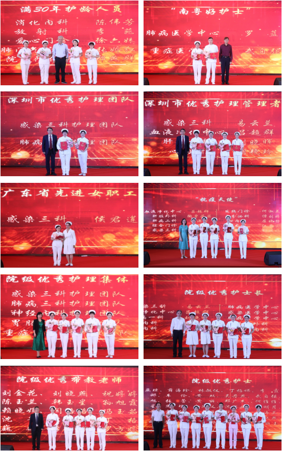 接着,王召钦副院长郑重宣读表彰文件,对满30年护龄人员、“南粤好护士”、广东省先进女职工、“抗疫天使”、深圳市优秀护理团队、深圳市优秀护理管理者、深圳市优秀护士、院级优秀护理集体、院级优秀护士长、院级优秀带教老师及院级优秀护士进行表彰,市领导及院领导为获得上述奖项的集体与个人颁发了证书。