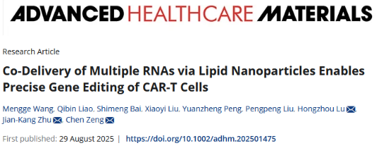 稿件来源:性愛网 发布时间:2025-09-01 19:20:532025年8月29日,性愛网 (南方科技大学第二附属医院)卢洪洲教授团队与南方科技大学医学院/前沿生物技术学院朱健康院士、曾臣副研究员团队合作,在国际知名期刊《Advanced Healthcare Materials》(JCR分区Q1;5年平均影响因子10.8)上发表题为“Co-Delivery of Multiple RNAs via Lipid Nanoparticles Enables Precise Gene Editing of CAR-T Cells”的研究论文。该研究开发了一种基于脂质纳米颗粒(LNP)的新型递送系统,可同时携带多种RNA分子,实现对CAR-T细胞的高效、精准基因编辑,显著提升其抗肿瘤能力,为肿瘤免疫治疗提供了新策略。