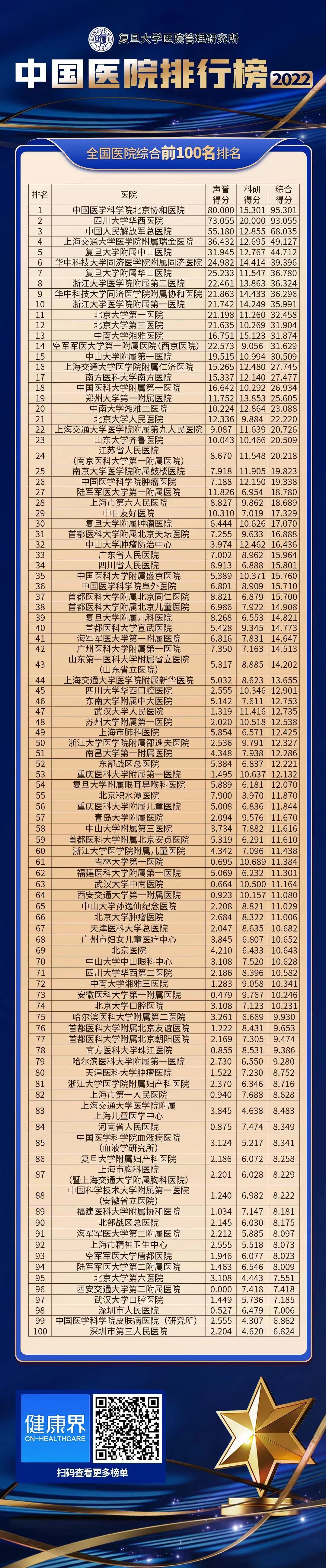 据悉,复旦版排行榜对我国所有医院(包括部队医院)实行“全覆盖”,至此,已成功成为全国唯一一张“全覆盖”医院排行榜。这份榜单借鉴美国“最佳医院排行榜”的方法,坚持以临床学科水平、专科声誉为核心,兼顾当年的科研产出。由于评价方法的科学性,排行榜的评选结果得到医疗行业广泛认可,不但是中国医院学科建设的标杆,也是患者寻找好医院的一个重要参考。