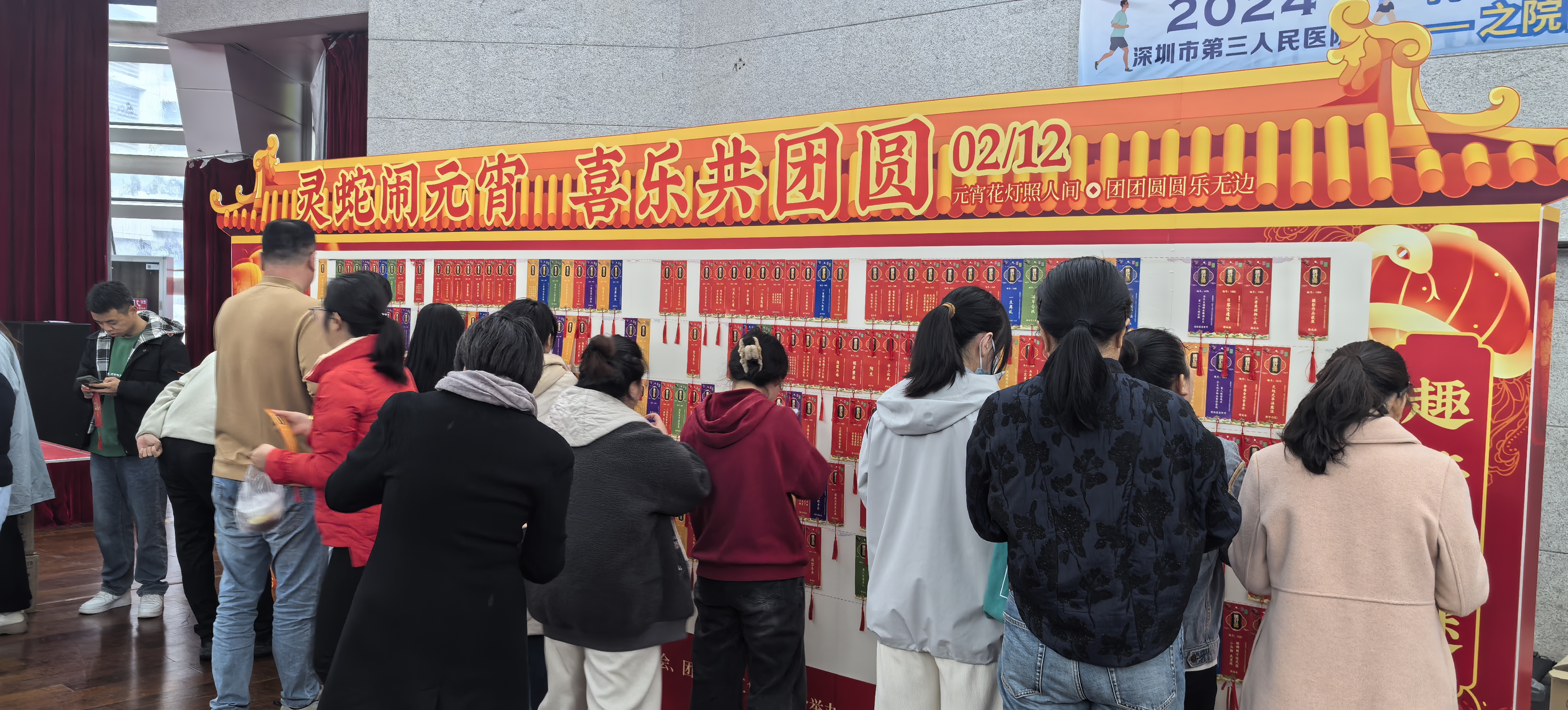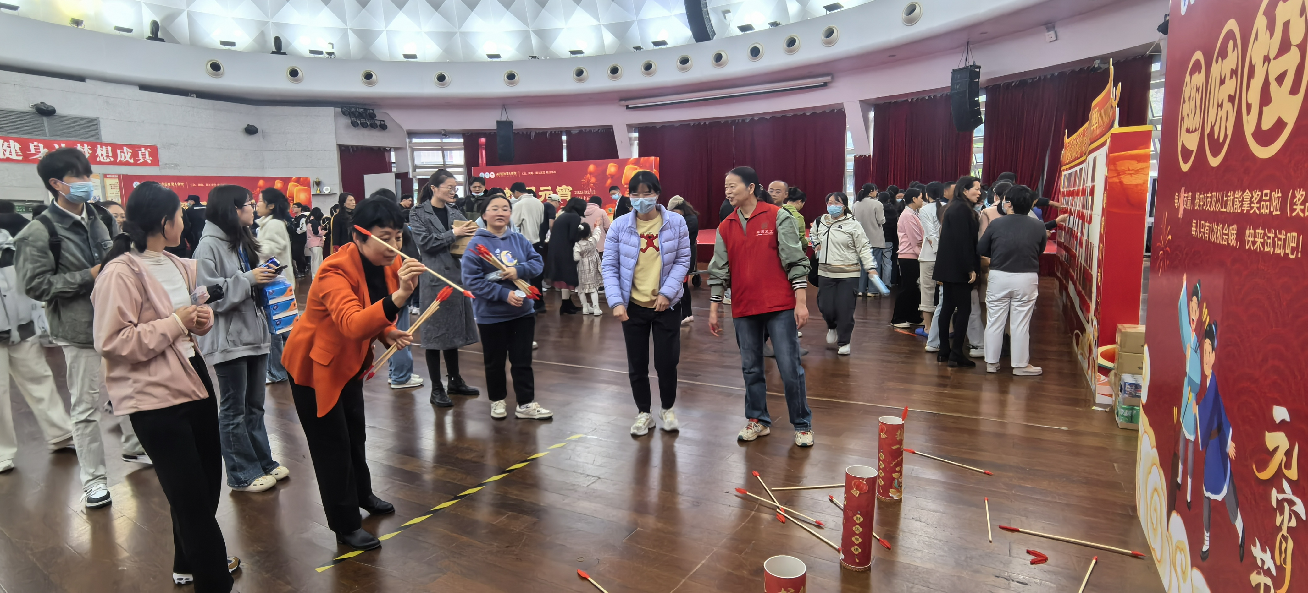 活动现场设置了趣味猜灯谜区域,一条条写有灯谜的彩条悬挂整齐,内容涵盖字谜、成语谜、科普知识谜等,大家兴致勃勃地思索、讨论,现场气氛热烈。