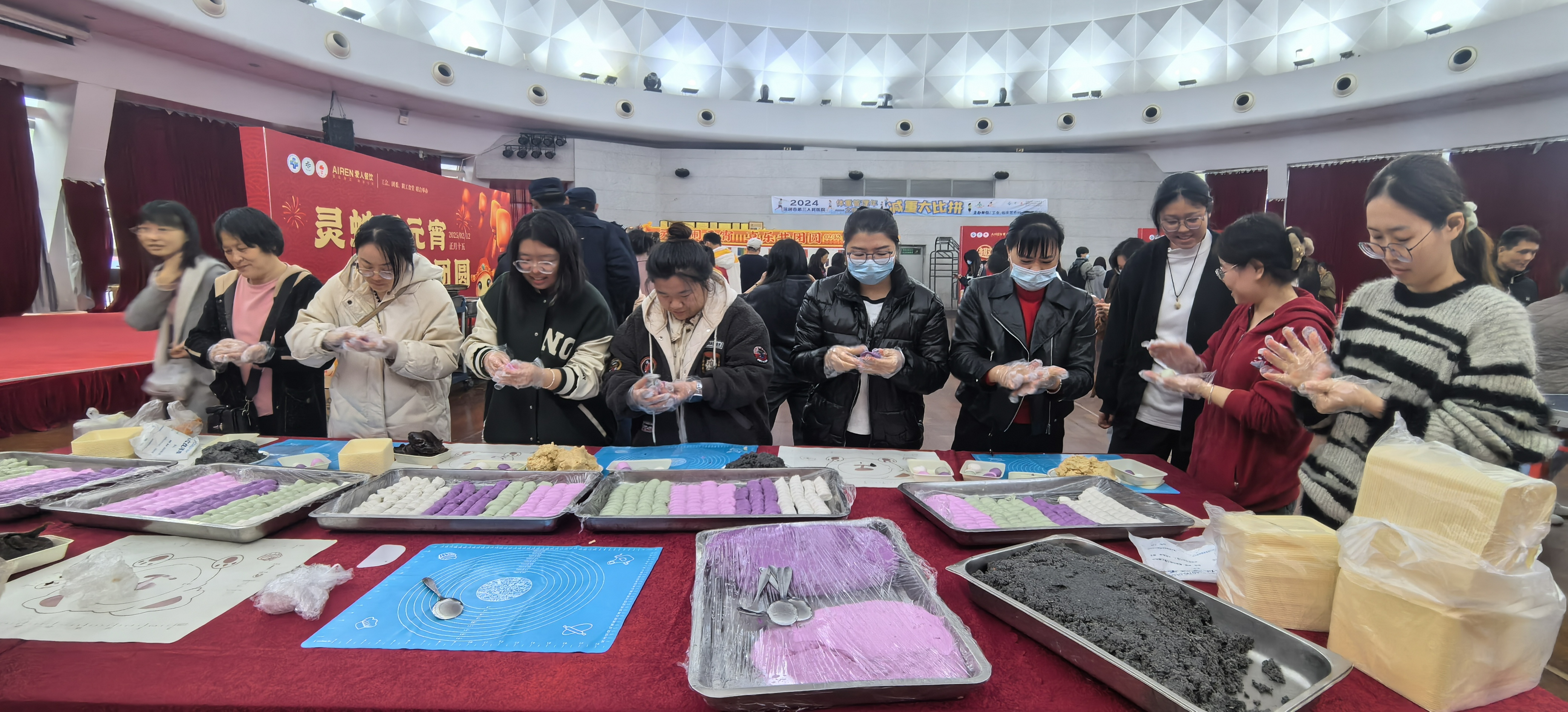 在手工制作区,参与者们围在一起,利用各色食材制作元宵,欢声笑语不断。