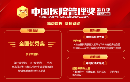 同时,我院在中南区域评选中同样收获颇丰,药学部选送的《公立医院高质量发展导向下传染病药房应急管理创新--4R理论驱动的医防协同效能提升实践》案例获评医改创新赛道中南区域优秀奖;招标采购办公室选送的《制度统一、科技赋能、协同联动--采购内控体系建设》案例获评后勤管理赛道中南区域优秀奖。