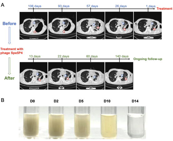 本研究针对一名罹患多药耐药性粘质沙雷菌胸腔感染的患者,通过筛选获得了噬菌体 Spe5P4,并结合常规抗生素进行联合治疗。结果表明,患者的临床症状显著改善,胸腔积液减少,肺部影像学显示感染区域得到有效控制。治疗过程中,肝肾功能及免疫指标均未出现异常变化,且未观察到明显的不良反应。更为重要的是,研究未发现目标细菌对噬菌体的耐药性,进一步验证了噬菌体治疗的稳定性与可靠性。