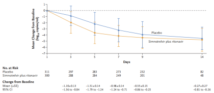 先诺特韦(Simnorelvirv,SIM0417)是靶向于3CLpro的小分子抗病毒药物。已经于2023年1月29日在中国获批用于治疗轻至中度新冠感染患者的紧急使用授权(EUA)。该研究从我国35个中心纳入1208例患者(先诺特韦组603例,安慰剂组605例)。在改良意向性治疗人群(mITT)中,先诺特韦组的症状消退时间明显短于安慰剂组(180.1 vs 216.0小时),中位差异为-35.8小时(95%CI:-60.1~-12.4;Peto-Prentice检验P=0.006)。第5天时先诺特韦组的病毒载量降幅也显著大于安慰剂组(平均差异为-1.51±0.14 log10 copies/mL;95%CI:-1.79~-1.24)。治疗期间,先诺特韦组的不良事件发生率高于安慰剂组(29.0% vs 21.6%),但大多数不良事件为轻度或中度。