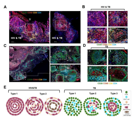 TB患者肺部病病理结果显示三种不同类型的肉芽肿,而HIV & TB患者肺部病理显示有两种不同类型的肉芽肿;TB患者肉芽肿以CD20+ B细胞聚集为主,HIV & TB患者炎症聚集部位以CD68+ 巨噬细胞为主。