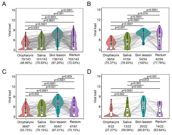 图:猴痘患者不同部位的样本病程相关的的MPXV阳性率比较