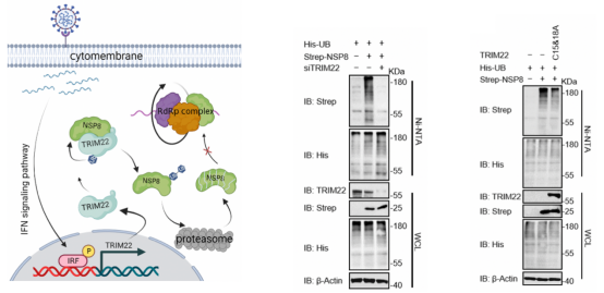 SARS-CoV-2复制和转录的关键是由NSP12、NSP7和NSP8组成的 RNA 依赖性RNA聚合酶(RdRp)。NSP12催化病毒RNA的合成,而NSP8与辅助因子NSP7共同激活并维持病毒RNA的产生。NSP8在识别病毒RNA和形成复合物、促进病毒RNA的转录和复制方面发挥着关键作用。由NSP12、NSP7、NSP8和RNA双链体形成的复合物被称为中心RTC(C-RTC),它是 RdRp活性的标志。此外,NSP8还具有免疫调节特性。它可以通过靶向 RIG-I/MDA5、TRIF和STING等关键信号分子来抑制I型和III型干扰素(IFN)的产生。此外,NSP8还能损伤线粒体并诱导不完全的有丝分裂。这些发现凸显了 NSP8的多功能性及其在 SARS-CoV-2感染期间调节宿主免疫反应和细胞过程的潜在作用。本项研究发现 SARS-CoV-2 感染可以诱导 TRIM22 的表达。而TRIM22可以作为E3泛素连接酶与NSP8蛋白结合,诱导NSP8蛋白在K97处发生多泛素化,进而导致泛素化的NSP8蛋白被蛋白酶体识别和降解。这一过程可大大降低 NSP8 蛋白水平,削弱RdRp的活性,最终抑制病毒复制。这项研究丰富了宿主抗病毒机制,为针对 NSP8-TRIM22的药物开发提供了新策略。