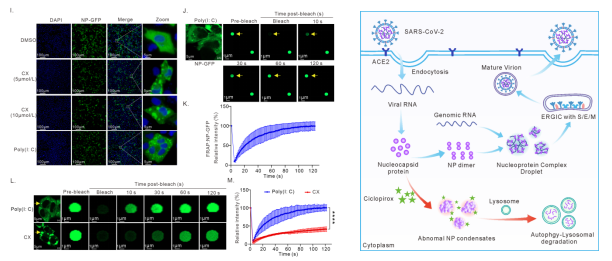 考虑到NP功能抑制剂开发的困难和NP超长半衰期导致的高丰度特征,本研究旨在鉴定可促进NP降解的小分子化合物。团队通过构建筛药细胞模型,从FDA批准化合物库中筛选到NP抑制剂—Ciclopirox。Ciclopirox可与NP间接结合,诱导NP异常聚集并形成凝集物。但该凝集物与poly(I:C)诱导NP发生液液相分离形成的凝集物具有显著差异。Ciclopirox主要诱导NP形成较高粘稠度和较低迁移率的凝集物,该凝集物可与自噬-溶酶体标志物共定位,提示Ciclopirox介导的NP凝集物主要通过自噬溶酶体途径降解,最终导致NP半衰期显著缩短。进一步研究发现Ciclopirox可在体内外实验中显著抑制SARS-CoV-2复制。以上研究可为治疗新冠病毒以及防范未来突变株的流行提供一种极具潜力的研究策略和靶标药物。