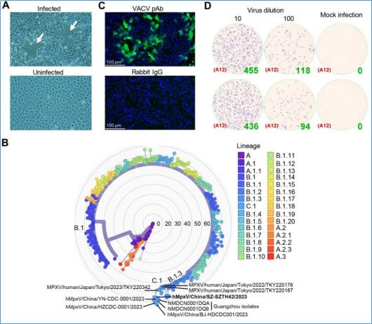图:SZTH42的分离与鉴定。MPXV增殖诱导VeroE6细胞的细胞病变效应