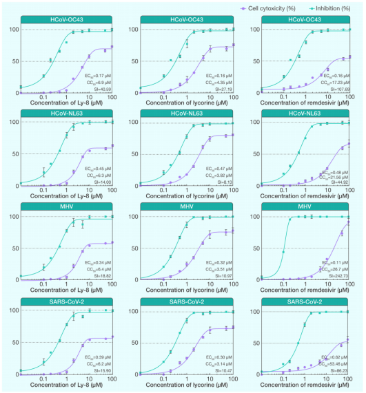 图:Ly-8对不同冠状病毒的抑制活性以及细胞毒性测定