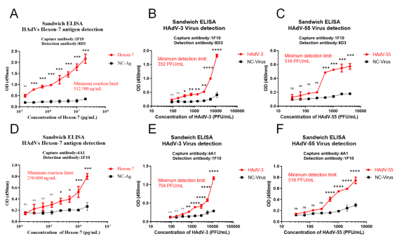 人腺病毒(Human adenovirus, HAdV)作为急性呼吸道传染病最常见的病原体之一,目前已有116个基因型别,导致呼吸道感染的血清型别就十种以上,国内外呼吸道感染形势严峻,但目前尚无针对HAdV感染的有效药物和疫苗,因此制备具有高度靶向性的广谱单克隆抗体,研制覆盖度搞的诊断试剂对预防和控制HAdV感染具有重要意义。研究团队首先筛选出Penton、Hexon、IVa2基因中保守性最强的3个抗原片段,然后制备了相应的鼠源单克隆抗体。筛选出来的鼠单抗具有高亲和力、强特异性、可广谱识别人呼吸道腺病毒的优势,其中单抗Hexon-1F10、Hexon-8D3可识别HAdV-1、HAdV-2、HAdV-3、HAdV-4、HAdV-5、HAdV-7、HAdV-21、HAdV-55这8个型别的人呼吸道腺病毒,单抗Hexon-4A1可识别HAdV-1、HAdV-2、HAdV-3、HAdV-5、HAdV-7、HAdV-21、HAdV-55这7个型别。此外,通过进一步筛选发现1F10-8D3和4A1-1F10这两组抗体配对可识别多种人呼吸道腺病毒感染,能够作为HAdV新型抗原诊断试剂的原料,也为人腺病毒广谱抗病毒药物研发提供了潜在靶标。