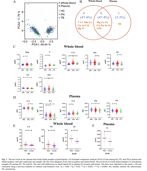 作者发现肺结核患者(TB)组和其他组之间多种离子呈现出不同的水平,全血样品中检测到有18种离子,血浆中检测到有10种离子,全血与血浆均含有9种离子。部分离子如Cu和Pb可以有效区分TB组与HC组、PN组。本研究探讨了结核患者体内离子水平在诊断结核病和治疗结果监测方面可能性,发现了多种具有诊断和监测前景的离子,为后续开发新型诊断生物标识物奠定理论基础。