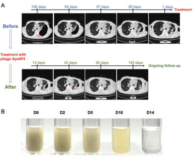 本研究针对一名罹患多药耐药性粘质沙雷菌胸腔感染的患者,通过筛选获得了噬菌体 Spe5P4,并结合常规抗生素进行联合治疗。结果表明,患者的临床症状显著改善,胸腔积液减少,肺部影像学显示感染区域得到有效控制。治疗过程中,肝肾功能及免疫指标均未出现异常变化,且未观察到明显的不良反应。更为重要的是,研究未发现目标细菌对噬菌体的耐药性,进一步验证了噬菌体治疗的稳定性与可靠性。)