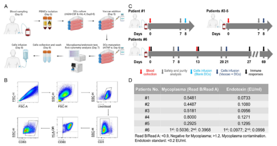 该研究使用了卡介苗感染其靶细胞-巨噬细胞,然后通过反复冻融和紫外灭活的方式,释放被巨噬细胞吞噬和切割的卡介苗片段,并灭活卡介苗,以实现更好的应用安全性。此外,考虑到该片段的免疫原性有限,该团队引入专职抗原提呈细胞即树突状细胞作为辅助。研究结果发现,该片段能够在体外诱导树突状细胞的成熟,该片段和树突状细胞的静脉免疫,能够在小鼠模型中诱导与卡介苗活菌水平相当的免疫应答和抗结核菌感染免疫保护。此外,一项由研究者发起的临床试验显示了含有非感染性母牛分枝杆菌疫苗的树突状细胞疫苗的安全性。初始DC 和含有母牛分枝杆菌的 DC 的输注在六名活动性结核病患者中具有良好的耐受性和安全性。 对接受两剂 DC 疫苗输注的患者的外周血单核细胞进行的测试显示,CD4 和 CD8 T 细胞中 IFN-γ、IL-2、IL-17 和 TNF-α 的分泌增强。 该研究提供的证据表明,含有灭活分枝杆菌的 DC 疫苗可以扩大感染结核病小鼠的 T 细胞免疫反应,并且在活动性结核病患者中具有良好的耐受性。
