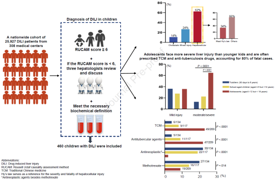研究涵盖了2012年至2014年间308个医疗中心的25,927例疑似DILI病例。通过Roussel Uclaf因果关系评估方法(RUCAM)评分,只有评分大于6或经至少两位专家诊断为DILI的患者被纳入分析。最终,460例符合欧洲肝病学会(EASL)生化标准的儿童被纳入研究。研究将儿童分为三个年龄组:幼儿(30天至6岁)、学龄儿童(6至12岁)和青少年(12至18岁)。 研究结果显示,肝细胞损伤是主要的临床分类,占63%的病例,其中34%的病例符合Hy's Law标准。青少年构成了中度/重度DILI儿童的大多数(65%)。与年幼儿童相比,青少年面临更严重的肝损伤风险显著更高(调整后的比值比[aOR]=4.75, p=.002)。所有年龄组中,最常被开具的药物类别是抗肿瘤药物(25.9%)、抗微生物药物(21.5%)和中药(TCM, 13.7%)。对于青少年,最常被怀疑的药物是抗结核药物(22%)和中药(23%)。 研究结论指出,与年幼儿童相比,青少年面临更严重和可能致命的肝损伤风险更大。认识到儿童DILI的风险对于确保安全的医疗实践至关重要。研究还强调了对儿童DILI患者进行谨慎护理和仔细监测的重要性,以及需要进行额外的多中心前瞻性研究来评估门诊和住院儿童患者的肝毒性风险。
