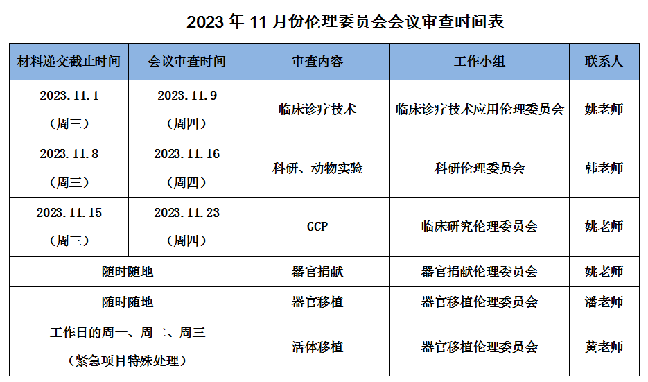 2023年11月份伦理委员会会议审查时间表