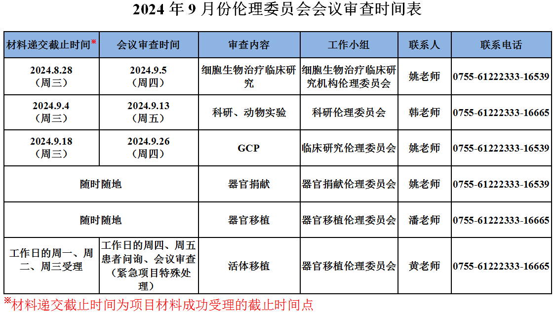 2024年9月份伦理委员会会议审查时间安排
