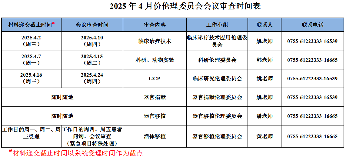 伦理委员会2025年4月会议审查时间安排如下,如有临时调整,将另行通知。