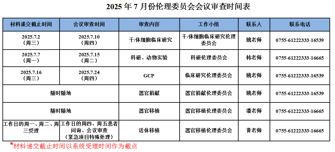 伦理委员会2025年7月会议审查时间安排如下,如有临时调整,将另行通知。