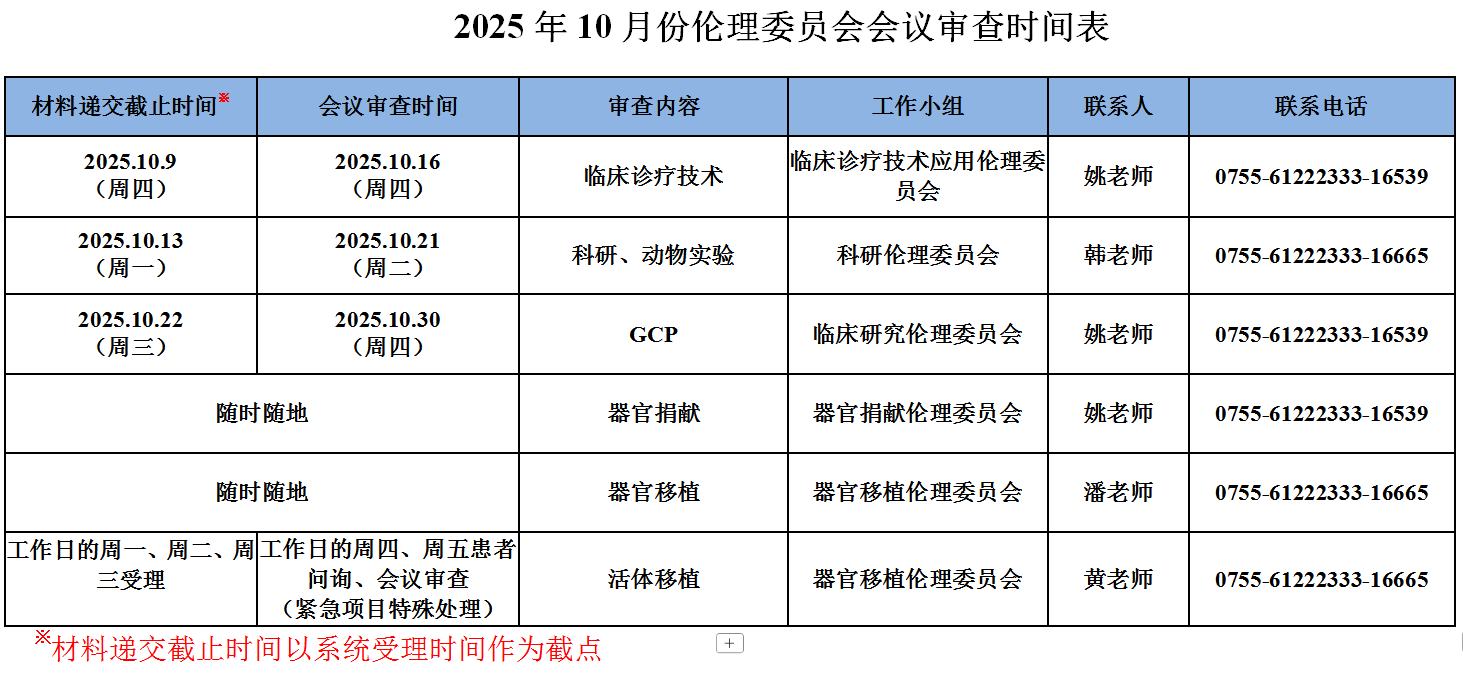伦理委员会2025年10月会议审查时间安排如下,如有临时调整,将另行通知。