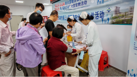 护士们也在现场紧张而有序地忙碌着,为患者们提供免费的血糖、血压、糖化血红蛋白检测等服务。护士们以通俗易懂的方式向患者及家属耐心解释了检测结果的含义,同时给出了详细的护理建议。